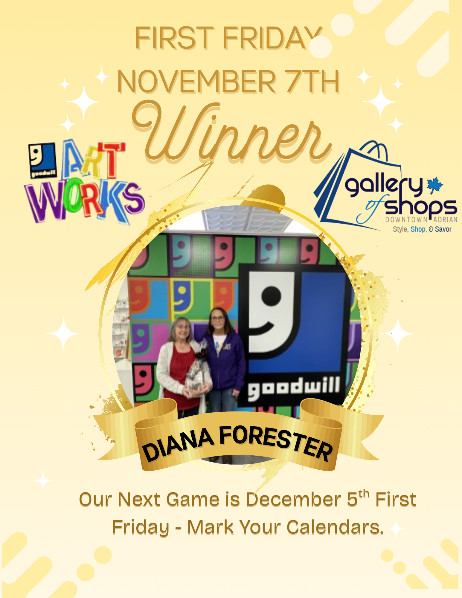 Congratulations to Diana Forester, our First Friday Gallery Game winner! ArtWorks by Goodwill hosted this month’s event, bringing creativity and community together inside The Gallery of Shops. Thank you to everyone who stopped in to play and support our local businesses.
