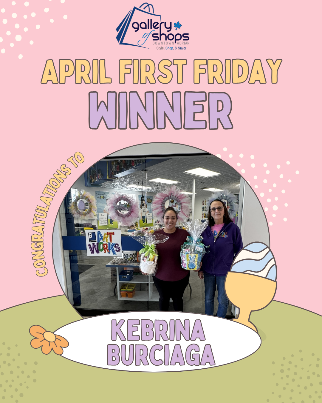 Congratulations to Kebrina Burciaga, the winner of our April First Friday giveaway at the Gallery of Shops in Downtown Adrian. Kebrina took home two Easter baskets filled with festive goodies and spring surprises.